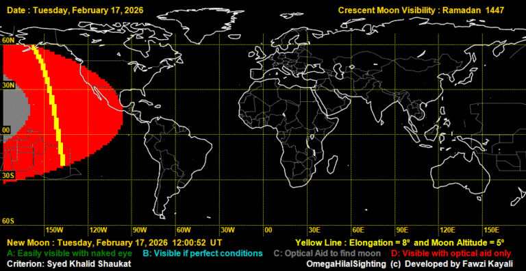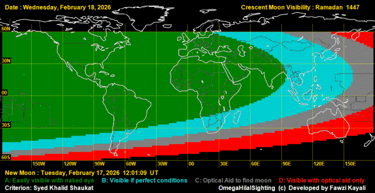 وبحسب التقرير الصادر عن مصدر مونسایتینگ (Moon Sighting)، فإن هلال القمر لن يكون قابلًا للرؤية في أي نقطة من العالم يوم الثلاثاء 17 فبراير/شباط 2026.