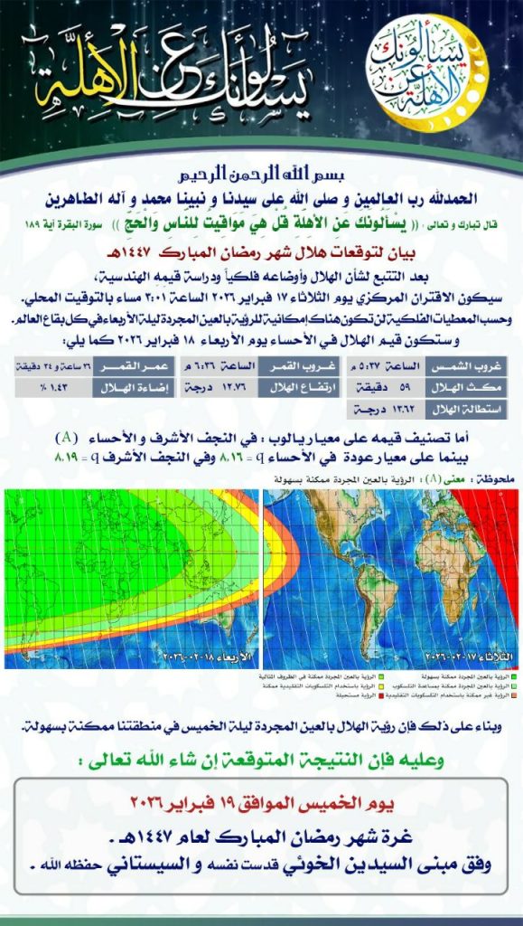 وجاء في كراس مواقيت الأهلة لعام 1447ه الصادر عن مكتب سماحة المرجع الديني آية الله السيد علي السيستاني “دام ظله”: